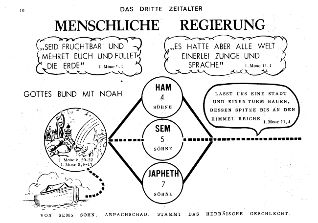 Das dritte Zeitalter: die "Menschliche Regierung" 1) Gott macht einen Bund mit Noah (l. Mose 8:20-22; 9:8-17) 2) Die Erde wird das nächste Mal mit Feuer zerstört (2. Petr.3:6-7) 3) Noahs Söhne sollen die Erde bevölkern (l. Mose 9:1) 4) Harm ist verflucht, Shem und Japeth gesegnet  (l. Mose 9:20-27) 5) Die ganze Welt spricht eine Sprache (l. Mose 11:1) 6) Der Turmbau zu Babel ( l. Mose 11:2-4). |