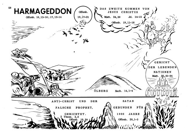 Die Schlacht von Armageddon 1) Nach den Schalen des Zornes folgt das Gericht über den Antichristen (Offb. 17,18) 2) Die Bildung von Nationen ist schon seit der Zeit Nimrods da, das ein antichristliches System ist und dies hat mit dem Turmbau zu Babel angefangen (1. Mose 11) 3) Das Bild, das Daniel sah, hatte einen: Kopf aus Gold, damit war Babylon gemeint, Brust und Arme aus Silber standen für die Meder + Perser; Bauch und Hüfte aus Messing die Griechen; Beine aus Eisen das Römerreich; Füße aus Eisen und Ton vermengt stehen für die Vereinigung von Rom mit 10 Nationen, welche die 10 Zehen und 10 Hörner des Tieres sind (Offb. 17) 4) Zum Schluß wird die Kirche des Antichristen, welche alle Religionen vereinigt hat, durch die Nationen zerstört 5) Israel wird mit einer ehebrechenden Frau verglichen, ("Ihr Mann ist Gott") welche verstoßen wurde, aber während der Trübsal wieder angenommeen und aufgebaut wird. (Je. 54:1-10. Hos. 2) 6) In der Mitte der 7 Jahre wird der Antichrist sich als Gott erheben lassen, den jüdischen Gottesdienst verhindern und die Juden verfolgen, um sie ganz zu vernichten. Dann werden sie in ihrer Not ihren Gott anrufen (Sach. 14:13; Jes. 10:20-21; Hos. 5:15; Sach. 13:9) 7) Die Juden werden dann Jesus als ihren Gott erkennen, "den sie am Kreuz durchbohrt haben " (Sach. 13:9) 8) Jesus wird wieder vom Himmel zu dem Ölberg kommen (Sach. 14:4-7) 9) Christus und seine Armee besiegen den Antichristen und sein Reich (Jes. 26:21; 63:1-4; Offb. 1:7; 19:11-21, Jud. 1:14) 10) Jesus Christus ist der "Stein aus dem Berg geschnitten" (Dan. 2:34-35,44) 11) Die große Schlacht (Offb. 19:17-18; 14:20, Hes. 39:12-13) 12) Das Tier und der falsche Prophet vernichtet (Offb. 14:10.19:20, 2. Thess. 2:8) 13) Vollendung der ersten Auferstehung der Gerechten (Offb. 20:4-6, Joh. 5:29) 14) Gericht der lebenden Nationen (Apg. 17-31, Mt. 25,31-46) 15) Satan für 1000 Jahre gebunden (Offb. 20,1-3) |