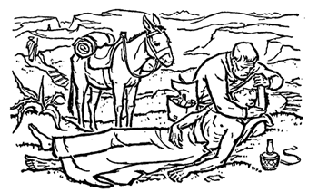 he binds and treats the wounds, brings the casualty into an inn, pays